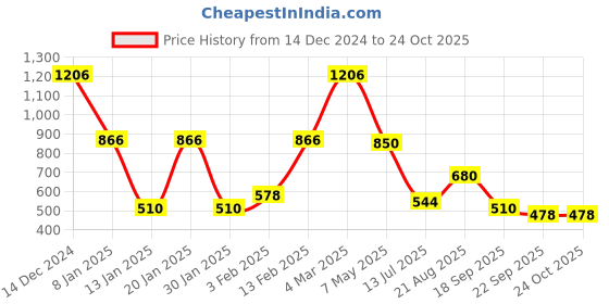 Great news for shoppers! The current price of ₹478 is at its best ever level. Over the 314 day price history period, prices have ranged from ₹478 to ₹1,206, with an average of ₹725. The pricing shows high volatility with significant fluctuations, and the overall trend is favorable for consumers as prices are getting cheaper. In terms of recent activity, there have been 0 price changes this week, 0 this month, and 12 over the past year. If you need this product now, it's a reasonable time to buy as prices are stable, but you might want to monitor for potential better deals.