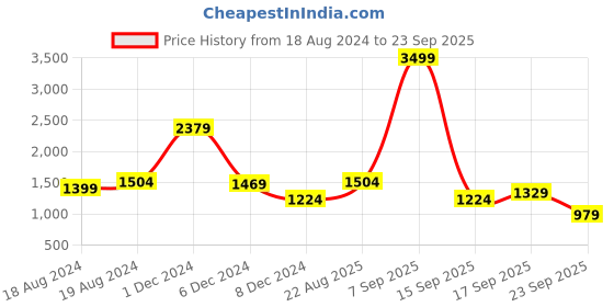 Awesome! The current price of ₹979 is at its best ever level. Over the 401 day price history period, prices have ranged from ₹979 to ₹3,499, with an average of ₹1,651. The pricing shows high volatility with significant fluctuations, and the overall trend is favorable for consumers as prices are getting cheaper. In terms of recent activity, there have been 0 price changes this week, 0 this month, and 7 over the past year. This is an excellent time to make a purchase as prices are trending downward and conditions appear favorable.