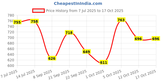 The current price is ₹696, which is ₹85 (13.9%) higher than the best price of ₹611 last seen on 1 Oct 2025. Over the 101 day price history period, prices have ranged from ₹611 to ₹763, with an average of ₹697. The pricing shows moderate volatility, and the overall trend is favorable for consumers as prices are getting cheaper. In terms of recent activity, there have been 0 price changes this week, 4 this month, and 7 over the past year. If you need this product now, it's a reasonable time to buy as prices are stable, but you might want to monitor for potential better deals.