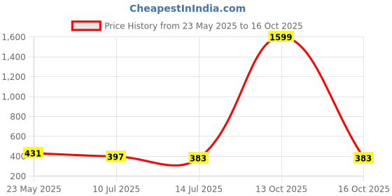 Exciting update! The current price of ₹383 is at its best ever level. Over the 146 day price history period, prices have ranged from ₹383 to ₹1,599, with an average of ₹639. The pricing shows high volatility with significant fluctuations, and the overall trend is favorable for consumers as prices are getting cheaper. In terms of recent activity, there has been 1 price change this week, 1 this month, and 4 over the past year. If you need this product now, it's a reasonable time to buy as prices are stable, but you might want to monitor for potential better deals.
