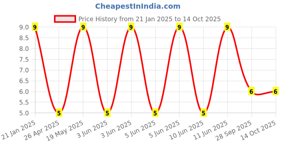 The current price is ₹6, which is ₹1 (20.0%) higher than the best price of ₹5 last seen on 26 Apr 2025. Over the 265 day price history period, prices have ranged from ₹5 to ₹9, with an average of ₹7. The pricing shows high volatility with significant fluctuations, and the overall trend is favorable for consumers as prices are getting cheaper. In terms of recent activity, there have been 0 price changes this week, 0 this month, and 9 over the past year. If you need this product now, it's a reasonable time to buy as prices are stable, but you might want to monitor for potential better deals.