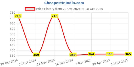 The current price is ₹365, which is ₹6 (1.7%) higher than the best price of ₹359 last seen on 28 Oct 2024. Over the 355 day price history period, prices have ranged from ₹359 to ₹718, with an average of ₹464. The pricing shows high volatility with significant fluctuations, and the overall trend is favorable for consumers as prices are getting cheaper. In terms of recent activity, there have been 0 price changes this week, 0 this month, and 5 over the past year. If you need this product now, it's a reasonable time to buy as prices are stable, but you might want to monitor for potential better deals.