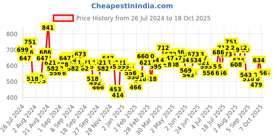 The current price is ₹556, which is ₹142 (34.3%) higher than the best price of ₹414 last seen on 16 Dec 2024. Over the 449 day price history period, prices have ranged from ₹414 to ₹841, with an average of ₹607. The pricing shows moderate volatility, and the overall trend is favorable for consumers as prices are getting cheaper. In terms of recent activity, there have been 0 price changes this week, 2 this month, and 64 over the past year. If you need this product now, it's a reasonable time to buy as prices are stable, but you might want to monitor for potential better deals.