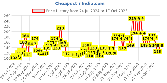 The current price is ₹125, which is ₹23 (22.5%) higher than the best price of ₹102 last seen on 24 Jul 2024. Over the 449 day price history period, prices have ranged from ₹102 to ₹249, with an average of ₹148. The pricing shows high volatility with significant fluctuations, but the overall trend is concerning as prices are getting more expensive. In terms of recent activity, there have been 0 price changes this week, 7 this month, and 68 over the past year. If you need this product now, it's a reasonable time to buy as prices are stable, but you might want to monitor for potential better deals.