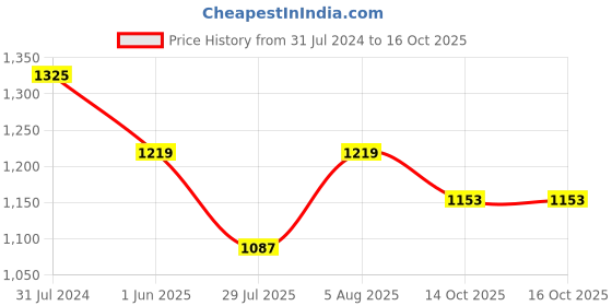 The current price is ₹1,153, which is ₹66 (6.1%) higher than the best price of ₹1,087 last seen on 29 Jul 2025. Over the 441 day price history period, prices have ranged from ₹1,087 to ₹1,325, with an average of ₹1,193. The pricing shows moderate volatility, and the overall trend is favorable for consumers as prices are getting cheaper. In terms of recent activity, there have been 0 price changes this week, 0 this month, and 3 over the past year. If you need this product now, it's a reasonable time to buy as prices are stable, but you might want to monitor for potential better deals.