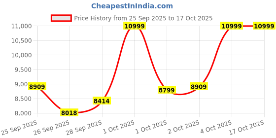 The current price is ₹10,999, which is ₹2,981 (37.2%) higher than the best price of ₹8,018 last seen on 26 Sep 2025. Over the 21 day price history period, prices have ranged from ₹8,018 to ₹10,999, with an average of ₹9,506. The pricing shows moderate volatility, but the overall trend is concerning as prices are getting more expensive. In terms of recent activity, there have been 0 price changes this week, 6 this month, and 6 over the past year. Consider waiting before making a purchase as prices are rising and better deals may be available later.