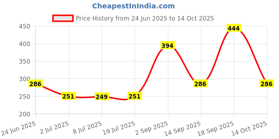 The current price is ₹286, which is ₹37 (14.9%) higher than the best price of ₹249 last seen on 8 Jul 2025. Over the 112 day price history period, prices have ranged from ₹249 to ₹444, with an average of ₹306. The pricing shows high volatility with significant fluctuations, with prices remaining relatively stable overall. In terms of recent activity, there have been 0 price changes this week, 1 this month, and 7 over the past year. If you need this product now, it's a reasonable time to buy as prices are stable, but you might want to monitor for potential better deals.