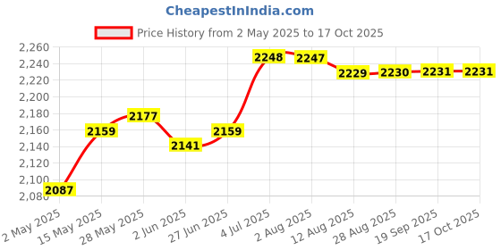 The current price is ₹2,231, which is ₹144 (6.9%) higher than the best price of ₹2,087 last seen on 2 May 2025. Over the 167 day price history period, prices have ranged from ₹2,087 to ₹2,248, with an average of ₹2,194. The pricing has been quite stable with low volatility, but the overall trend is concerning as prices are getting more expensive. In terms of recent activity, there have been 0 price changes this week, 0 this month, and 9 over the past year. If you need this product now, it's a reasonable time to buy as prices are stable, but you might want to monitor for potential better deals.