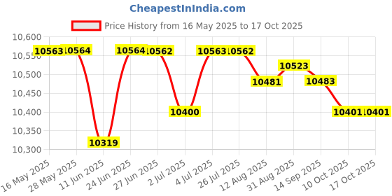 The current price is ₹10,401, which is ₹82 (0.8%) higher than the best price of ₹10,319 last seen on 11 Jun 2025. Over the 153 day price history period, prices have ranged from ₹10,319 to ₹10,564, with an average of ₹10,491. The pricing has been quite stable with low volatility, with prices remaining relatively stable overall. In terms of recent activity, there have been 0 price changes this week, 0 this month, and 11 over the past year. If you need this product now, it's a reasonable time to buy as prices are stable, but you might want to monitor for potential better deals.