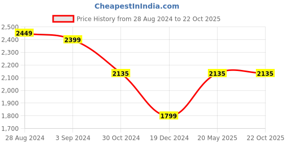 The current price is ₹2,135, which is ₹336 (18.7%) higher than the best price of ₹1,799 last seen on 19 Dec 2024. Over the 419 day price history period, prices have ranged from ₹1,799 to ₹2,449, with an average of ₹2,175. The pricing shows moderate volatility, and the overall trend is favorable for consumers as prices are getting cheaper. In terms of recent activity, there have been 0 price changes this week, 0 this month, and 2 over the past year. The price direction is uncertain, so monitor the situation for a few more days before making a decision.