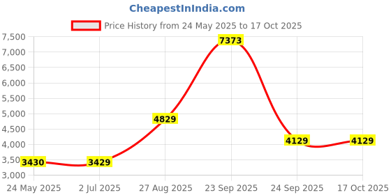 The current price is ₹4,129, which is ₹699.49 (20.4%) higher than the best price of ₹3,429.51 last seen on 2 Jul 2025. Over the 145 day price history period, prices have ranged from ₹3,429.51 to ₹7,373, with an average of ₹4,553. The pricing shows high volatility with significant fluctuations, but the overall trend is concerning as prices are getting more expensive. In terms of recent activity, there have been 0 price changes this week, 1 this month, and 4 over the past year. The price direction is uncertain, so monitor the situation for a few more days before making a decision.