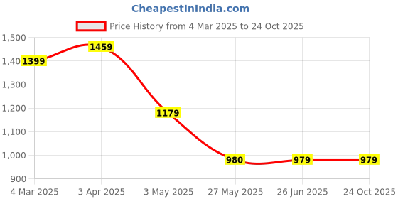 Great news for shoppers! The current price of ₹979.51 is at its best ever level. Over the 234 day price history period, prices have ranged from ₹979.51 to ₹1,459, with an average of ₹1,163. The pricing shows high volatility with significant fluctuations, and the overall trend is favorable for consumers as prices are getting cheaper. In terms of recent activity, there have been 0 price changes this week, 0 this month, and 4 over the past year. If you need this product now, it's a reasonable time to buy as prices are stable, but you might want to monitor for potential better deals.