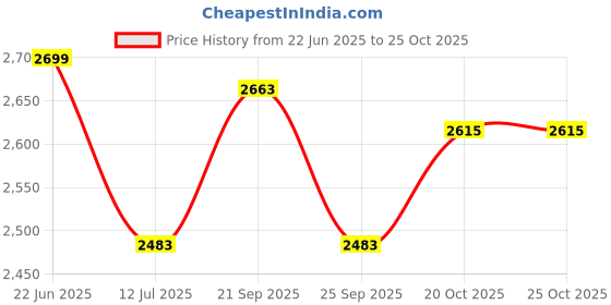 The current price is ₹2,615, which is ₹132 (5.3%) higher than the best price of ₹2,483 last seen on 12 Jul 2025. Over the 124 day price history period, prices have ranged from ₹2,483 to ₹2,699, with an average of ₹2,593. The pricing has been quite stable with low volatility, with prices remaining relatively stable overall. In terms of recent activity, there have been 0 price changes this week, 1 this month, and 4 over the past year. The price direction is uncertain, so monitor the situation for a few more days before making a decision.