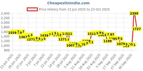 The current price is ₹1,727, which is ₹744 (75.7%) higher than the best price of ₹983 last seen on 5 Aug 2025. Over the 132 day price history period, prices have ranged from ₹983 to ₹2,399, with an average of ₹1,357. The pricing shows high volatility with significant fluctuations, but the overall trend is concerning as prices are getting more expensive. In terms of recent activity, there have been 0 price changes this week, 6 this month, and 47 over the past year. Consider waiting before making a purchase as prices are rising and better deals may be available later.