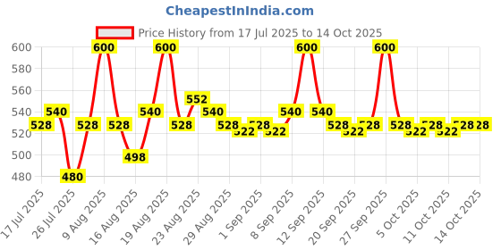 The current price is ₹528, which is ₹48 (10.0%) higher than the best price of ₹480 last seen on 26 Jul 2025. Over the 88 day price history period, prices have ranged from ₹480 to ₹600, with an average of ₹537. The pricing shows moderate volatility, with prices remaining relatively stable overall. In terms of recent activity, there have been 2 price changes this week, 7 this month, and 27 over the past year. If you need this product now, it's a reasonable time to buy as prices are stable, but you might want to monitor for potential better deals.