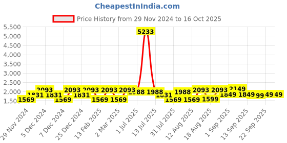 The current price is ₹1,849, which is ₹280 (17.8%) higher than the best price of ₹1,569 last seen on 29 Nov 2024. Over the 321 day price history period, prices have ranged from ₹1,569 to ₹5,233, with an average of ₹1,983. The pricing shows high volatility with significant fluctuations, but the overall trend is concerning as prices are getting more expensive. In terms of recent activity, there have been 0 price changes this week, 1 this month, and 26 over the past year. If you need this product now, it's a reasonable time to buy as prices are stable, but you might want to monitor for potential better deals.