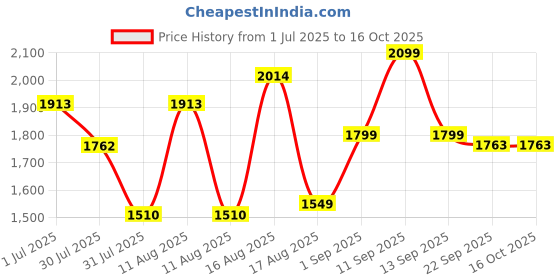 The current price is ₹1,763, which is ₹253 (16.8%) higher than the best price of ₹1,510 last seen on 31 Jul 2025. Over the 107 day price history period, prices have ranged from ₹1,510 to ₹2,099, with an average of ₹1,783. The pricing shows moderate volatility, and the overall trend is favorable for consumers as prices are getting cheaper. In terms of recent activity, there have been 0 price changes this week, 0 this month, and 10 over the past year. If you need this product now, it's a reasonable time to buy as prices are stable, but you might want to monitor for potential better deals.