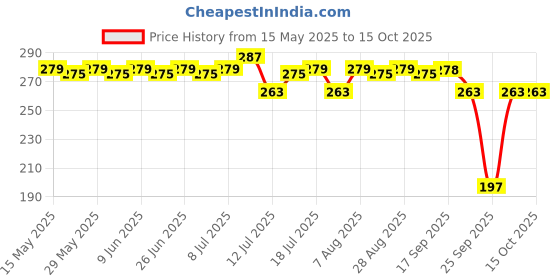 The current price is ₹263, which is ₹66 (33.5%) higher than the best price of ₹197 last seen on 25 Sep 2025. Over the 152 day price history period, prices have ranged from ₹197 to ₹287, with an average of ₹271. The pricing shows moderate volatility, and the overall trend is favorable for consumers as prices are getting cheaper. In terms of recent activity, there have been 0 price changes this week, 3 this month, and 21 over the past year. If you need this product now, it's a reasonable time to buy as prices are stable, but you might want to monitor for potential better deals.