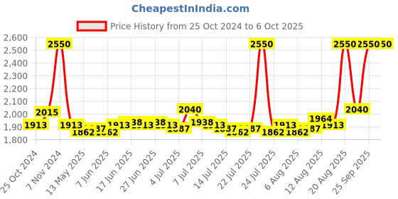 The current price is ₹2,550, which is ₹688 (36.9%) higher than the best price of ₹1,862 last seen on 13 May 2025. Over the 345 day price history period, prices have ranged from ₹1,862 to ₹2,550, with an average of ₹2,022. The pricing shows moderate volatility, but the overall trend is concerning as prices are getting more expensive. In terms of recent activity, there have been 0 price changes this week, 1 this month, and 28 over the past year. Consider waiting before making a purchase as prices are rising and better deals may be available later.