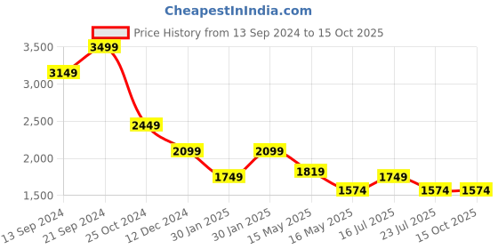 Exciting update! The current price of ₹1,574 is at its best ever level. Over the 397 day price history period, prices have ranged from ₹1,574 to ₹3,499, with an average of ₹2,121. The pricing shows high volatility with significant fluctuations, and the overall trend is favorable for consumers as prices are getting cheaper. In terms of recent activity, there have been 0 price changes this week, 0 this month, and 7 over the past year. This is an excellent time to make a purchase as prices are trending downward and conditions appear favorable.