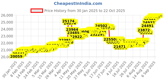 The current price is ₹25,900, which is ₹5,841 (29.1%) higher than the best price of ₹20,059 last seen on 30 Jan 2025. Over the 264 day price history period, prices have ranged from ₹20,059 to ₹25,900, with an average of ₹22,510. The pricing shows moderate volatility, but the overall trend is concerning as prices are getting more expensive. In terms of recent activity, there have been 0 price changes this week, 0 this month, and 114 over the past year. Consider waiting before making a purchase as prices are rising and better deals may be available later.