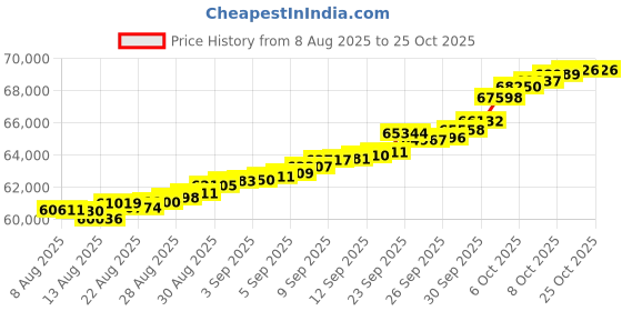 The current price is ₹69,326, which is ₹9,290 (15.5%) higher than the best price of ₹60,036 last seen on 13 Aug 2025. Over the 77 day price history period, prices have ranged from ₹60,036 to ₹69,326, with an average of ₹64,065. The pricing has been quite stable with low volatility, but the overall trend is concerning as prices are getting more expensive. In terms of recent activity, there have been 0 price changes this week, 8 this month, and 27 over the past year. Consider waiting before making a purchase as prices are rising and better deals may be available later.