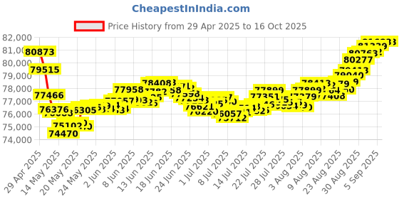 The current price is ₹81,683, which is ₹7,213 (9.7%) higher than the best price of ₹74,470 last seen on 16 May 2025. Over the 170 day price history period, prices have ranged from ₹74,470 to ₹81,683, with an average of ₹77,488. The pricing has been quite stable with low volatility, with prices remaining relatively stable overall. In terms of recent activity, there have been 0 price changes this week, 0 this month, and 72 over the past year. The price direction is uncertain, so monitor the situation for a few more days before making a decision.