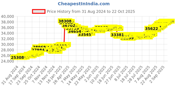 The current price is ₹38,170, which is ₹12,916 (51.1%) higher than the best price of ₹25,254 last seen on 9 Sep 2024. Over the 416 day price history period, prices have ranged from ₹25,254 to ₹38,308, with an average of ₹32,541. The pricing shows moderate volatility, but the overall trend is concerning as prices are getting more expensive. In terms of recent activity, there have been 0 price changes this week, 0 this month, and 104 over the past year. Consider waiting before making a purchase as prices are rising and better deals may be available later.