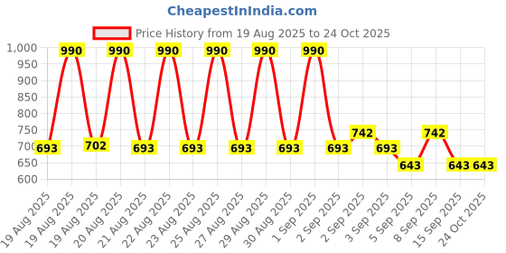 Good news! The current price of ₹643 is at its best ever level. Over the 66 day price history period, prices have ranged from ₹643 to ₹990, with an average of ₹785. The pricing shows high volatility with significant fluctuations, and the overall trend is favorable for consumers as prices are getting cheaper. In terms of recent activity, there have been 0 price changes this week, 0 this month, and 17 over the past year. If you need this product now, it's a reasonable time to buy as prices are stable, but you might want to monitor for potential better deals.