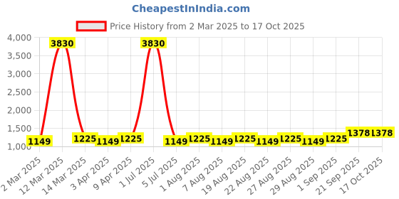 The current price is ₹1,378, which is ₹229 (19.9%) higher than the best price of ₹1,149 last seen on 2 Mar 2025. Over the 228 day price history period, prices have ranged from ₹1,149 to ₹3,830, with an average of ₹1,541. The pricing shows high volatility with significant fluctuations, but the overall trend is concerning as prices are getting more expensive. In terms of recent activity, there have been 0 price changes this week, 0 this month, and 14 over the past year. Consider waiting before making a purchase as prices are rising and better deals may be available later.