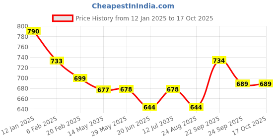 The current price is ₹689, which is ₹45 (7.0%) higher than the best price of ₹644 last seen on 20 Jun 2025. Over the 277 day price history period, prices have ranged from ₹644 to ₹790.3, with an average of ₹696. The pricing shows moderate volatility, and the overall trend is favorable for consumers as prices are getting cheaper. In terms of recent activity, there have been 0 price changes this week, 1 this month, and 9 over the past year. If you need this product now, it's a reasonable time to buy as prices are stable, but you might want to monitor for potential better deals.