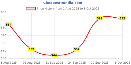 The current price is ₹592, which is ₹48 (8.8%) higher than the best price of ₹544 last seen on 11 Sep 2025. Over the 67 day price history period, prices have ranged from ₹544 to ₹592, with an average of ₹569. The pricing has been quite stable with low volatility, with prices remaining relatively stable overall. In terms of recent activity, there have been 0 price changes this week, 2 this month, and 4 over the past year. If you need this product now, it's a reasonable time to buy as prices are stable, but you might want to monitor for potential better deals.