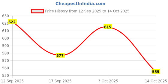 Great news for shoppers! The current price of ₹555 is at its best ever level. Over the 32 day price history period, prices have ranged from ₹555 to ₹622, with an average of ₹592. The pricing has been quite stable with low volatility, and the overall trend is favorable for consumers as prices are getting cheaper. In terms of recent activity, there have been 0 price changes this week, 2 this month, and 3 over the past year. If you need this product now, it's a reasonable time to buy as prices are stable, but you might want to monitor for potential better deals.
