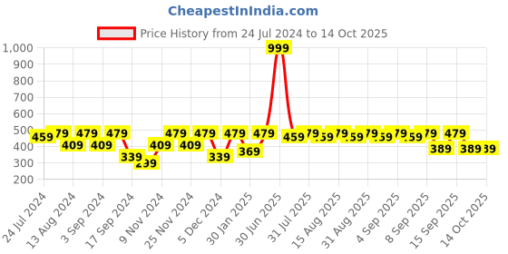 The current price is ₹389, which is ₹90 (30.1%) higher than the best price of ₹299 last seen on 25 Sep 2024. Over the 446 day price history period, prices have ranged from ₹299 to ₹999, with an average of ₹456. The pricing shows high volatility with significant fluctuations, and the overall trend is favorable for consumers as prices are getting cheaper. In terms of recent activity, there have been 0 price changes this week, 1 this month, and 21 over the past year. If you need this product now, it's a reasonable time to buy as prices are stable, but you might want to monitor for potential better deals.
