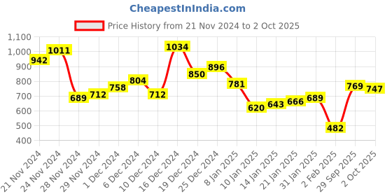 The current price is ₹747, which is ₹265 (55.0%) higher than the best price of ₹482 last seen on 2 Feb 2025. Over the 315 day price history period, prices have ranged from ₹482 to ₹1,034, with an average of ₹767. The pricing shows high volatility with significant fluctuations, and the overall trend is favorable for consumers as prices are getting cheaper. In terms of recent activity, there have been 0 price changes this week, 1 this month, and 17 over the past year. The price direction is uncertain, so monitor the situation for a few more days before making a decision.