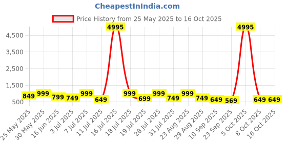 The current price is ₹649, which is ₹80 (14.1%) higher than the best price of ₹569 last seen on 23 Sep 2025. Over the 144 day price history period, prices have ranged from ₹569 to ₹4,995, with an average of ₹1,264. The pricing shows high volatility with significant fluctuations, and the overall trend is favorable for consumers as prices are getting cheaper. In terms of recent activity, there have been 0 price changes this week, 2 this month, and 16 over the past year. This is an excellent time to make a purchase as prices are trending downward and conditions appear favorable.