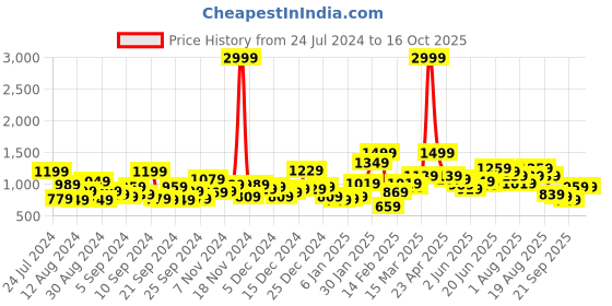 The current price is ₹959, which is ₹300 (45.5%) higher than the best price of ₹659 last seen on 6 Feb 2025. Over the 449 day price history period, prices have ranged from ₹659 to ₹2,999, with an average of ₹1,029. The pricing shows high volatility with significant fluctuations, and the overall trend is favorable for consumers as prices are getting cheaper. In terms of recent activity, there have been 0 price changes this week, 2 this month, and 44 over the past year. The price direction is uncertain, so monitor the situation for a few more days before making a decision.