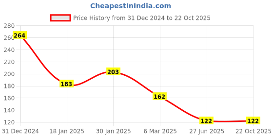 Great news for shoppers! The current price of ₹122 is at its best ever level. Over the 294 day price history period, prices have ranged from ₹122 to ₹264, with an average of ₹176. The pricing shows high volatility with significant fluctuations, and the overall trend is favorable for consumers as prices are getting cheaper. In terms of recent activity, there have been 0 price changes this week, 0 this month, and 4 over the past year. If you need this product now, it's a reasonable time to buy as prices are stable, but you might want to monitor for potential better deals.