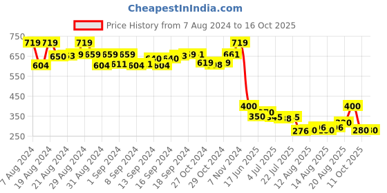The current price is ₹280, which is ₹4 (1.4%) higher than the best price of ₹276 last seen on 11 Aug 2025. Over the 434 day price history period, prices have ranged from ₹276 to ₹719, with an average of ₹527. The pricing shows high volatility with significant fluctuations, and the overall trend is favorable for consumers as prices are getting cheaper. In terms of recent activity, there have been 0 price changes this week, 0 this month, and 18 over the past year. This is an excellent time to make a purchase as prices are trending downward and conditions appear favorable.