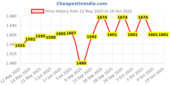 The current price is ₹1,601, which is ₹121 (8.2%) higher than the best price of ₹1,480 last seen on 9 Sep 2025. Over the 159 day price history period, prices have ranged from ₹1,480 to ₹1,674, with an average of ₹1,602. The pricing has been quite stable with low volatility, with prices remaining relatively stable overall. In terms of recent activity, there have been 0 price changes this week, 5 this month, and 13 over the past year. If you need this product now, it's a reasonable time to buy as prices are stable, but you might want to monitor for potential better deals.