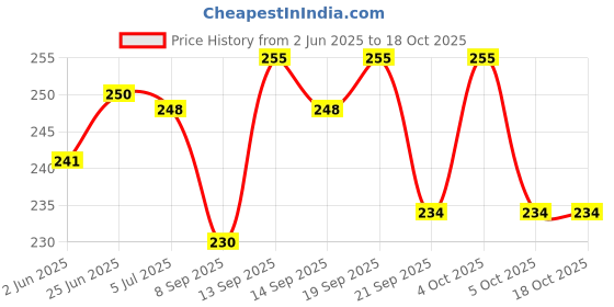The current price is ₹234, which is ₹4 (1.7%) higher than the best price of ₹230 last seen on 8 Sep 2025. Over the 138 day price history period, prices have ranged from ₹230 to ₹255, with an average of ₹244. The pricing has been quite stable with low volatility, with prices remaining relatively stable overall. In terms of recent activity, there have been 0 price changes this week, 3 this month, and 9 over the past year. If you need this product now, it's a reasonable time to buy as prices are stable, but you might want to monitor for potential better deals.