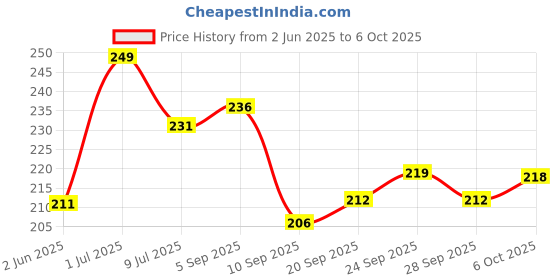 The current price is ₹212, which is ₹6 (2.9%) higher than the best price of ₹206 last seen on 10 Sep 2025. Over the 125 day price history period, prices have ranged from ₹206 to ₹249, with an average of ₹221. The pricing shows moderate volatility, with prices remaining relatively stable overall. In terms of recent activity, there have been 0 price changes this week, 3 this month, and 7 over the past year. If you need this product now, it's a reasonable time to buy as prices are stable, but you might want to monitor for potential better deals.