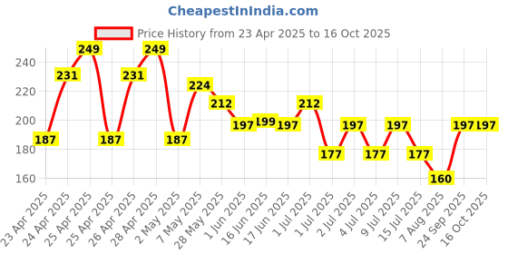 The current price is ₹197, which is ₹37 (23.1%) higher than the best price of ₹160 last seen on 7 Aug 2025. Over the 176 day price history period, prices have ranged from ₹160 to ₹249, with an average of ₹202. The pricing shows moderate volatility, but the overall trend is concerning as prices are getting more expensive. In terms of recent activity, there have been 0 price changes this week, 0 this month, and 19 over the past year. If you need this product now, it's a reasonable time to buy as prices are stable, but you might want to monitor for potential better deals.