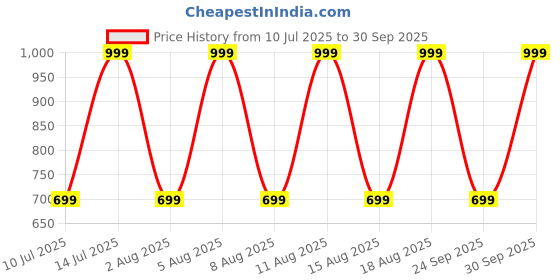 The current price is ₹999, which is ₹300 (42.9%) higher than the best price of ₹699 last seen on 10 Jul 2025. Over the 82 day price history period, prices have ranged from ₹699 to ₹999, with an average of ₹849. The pricing shows high volatility with significant fluctuations, but the overall trend is concerning as prices are getting more expensive. In terms of recent activity, there have been 0 price changes this week, 0 this month, and 9 over the past year. If you need this product now, it's a reasonable time to buy as prices are stable, but you might want to monitor for potential better deals.