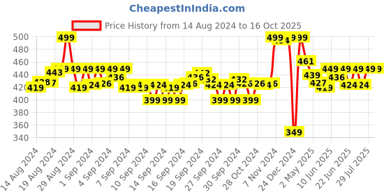 The current price is ₹449, which is ₹100 (28.7%) higher than the best price of ₹349 last seen on 24 Dec 2024. Over the 428 day price history period, prices have ranged from ₹349 to ₹499, with an average of ₹434. The pricing shows moderate volatility, but the overall trend is concerning as prices are getting more expensive. In terms of recent activity, there have been 0 price changes this week, 0 this month, and 20 over the past year. If you need this product now, it's a reasonable time to buy as prices are stable, but you might want to monitor for potential better deals.