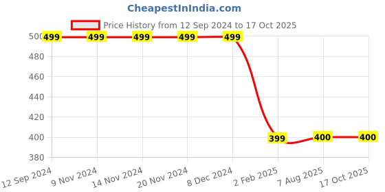 The current price is ₹400, which is ₹0.2 (0.1%) higher than the best price of ₹399.8 last seen on 2 Feb 2025. Over the 399 day price history period, prices have ranged from ₹399.8 to ₹499.5, with an average of ₹462. The pricing shows moderate volatility, and the overall trend is favorable for consumers as prices are getting cheaper. In terms of recent activity, there have been 0 price changes this week, 0 this month, and 5 over the past year. If you need this product now, it's a reasonable time to buy as prices are stable, but you might want to monitor for potential better deals.