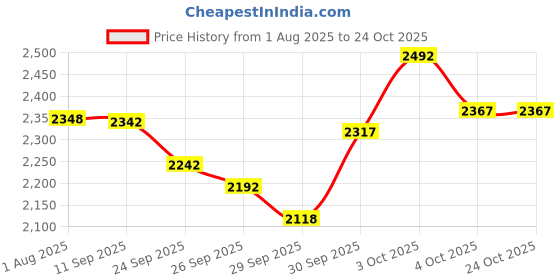 The current price is ₹2,367, which is ₹249 (11.8%) higher than the best price of ₹2,118 last seen on 29 Sep 2025. Over the 84 day price history period, prices have ranged from ₹2,118 to ₹2,492, with an average of ₹2,309. The pricing has been quite stable with low volatility, with prices remaining relatively stable overall. In terms of recent activity, there have been 0 price changes this week, 4 this month, and 7 over the past year. The price direction is uncertain, so monitor the situation for a few more days before making a decision.