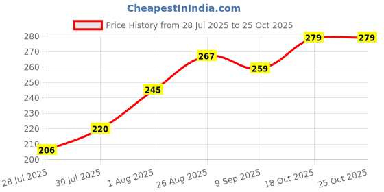 The current price is ₹279, which is ₹73 (35.4%) higher than the best price of ₹206 last seen on 28 Jul 2025. Over the 88 day price history period, prices have ranged from ₹206 to ₹279, with an average of ₹251. The pricing shows moderate volatility, but the overall trend is concerning as prices are getting more expensive. In terms of recent activity, there have been 0 price changes this week, 0 this month, and 5 over the past year. If you need this product now, it's a reasonable time to buy as prices are stable, but you might want to monitor for potential better deals.