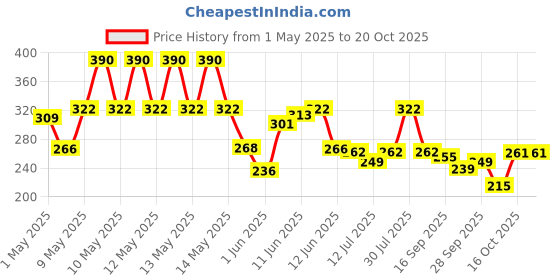 The current price is ₹261, which is ₹46 (21.4%) higher than the best price of ₹215 last seen on 5 Oct 2025. Over the 168 day price history period, prices have ranged from ₹215 to ₹390, with an average of ₹297. The pricing shows high volatility with significant fluctuations, and the overall trend is favorable for consumers as prices are getting cheaper. In terms of recent activity, there have been 0 price changes this week, 3 this month, and 26 over the past year. If you need this product now, it's a reasonable time to buy as prices are stable, but you might want to monitor for potential better deals.