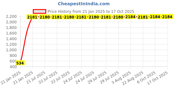 The current price is ₹2,184, which is ₹1,650 (309.0%) higher than the best price of ₹534 last seen on 21 Jan 2025. Over the 268 day price history period, prices have ranged from ₹534 to ₹2,184, with an average of ₹2,055. The pricing shows high volatility with significant fluctuations, but the overall trend is concerning as prices are getting more expensive. In terms of recent activity, there have been 0 price changes this week, 0 this month, and 11 over the past year. If you need this product now, it's a reasonable time to buy as prices are stable, but you might want to monitor for potential better deals.